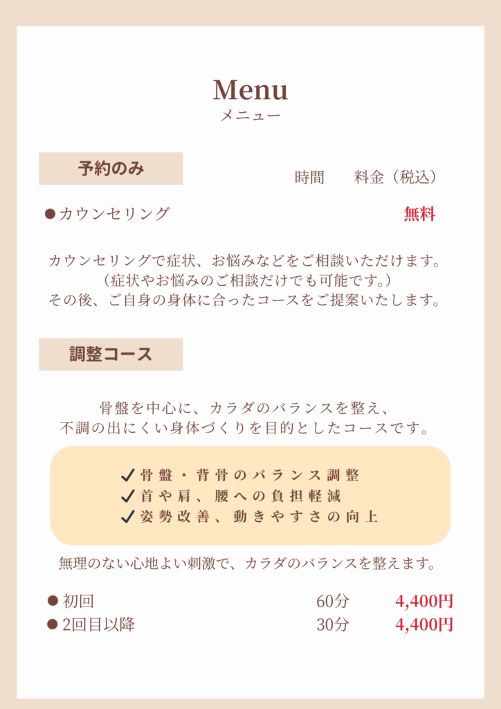 調整コースは、骨盤を中心に身体バランス、クセなどを整え、不調の出にくい身体を作っていきます。